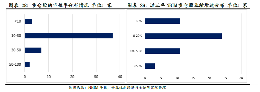 NBIM总体偏好较低估值的个股,80%的个股估值低于30倍:市盈率4个区间:小于10、10至30、30至50、大于50,公司数量分别为3、37、7、2,重仓股市盈率主要集中在10倍与30倍之间。对重仓股2016-2018三年期间的业绩增速进行分析,4个区间:小于0%、0%-20%、20%-50%、大于50%,公司数量分别为:11、24、11、3家。总体来看重仓公司业绩估值匹配较合理。