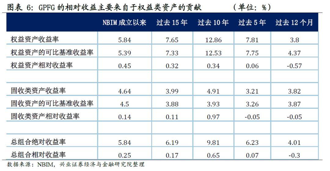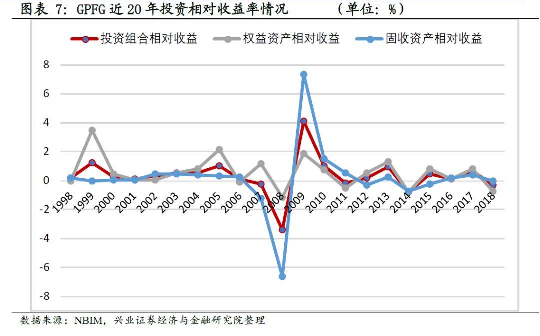 除了绝对收益外,NBIM根据FTSEGlobal All Cap Index和Bloomberg Barclays GlobalAggregate index分别编制了权益资产和固收资产的对照组合,用相对收益的方式来考核GPFG的业绩。截止2019年3月31日,GPFG过去20年的相对收益约0.25%,过去10年的相对收益约0.65%。按照资产分类来看,权益资产过去20年贡献了0.45%的相对收益,固收类资产贡献了0.14%的相对收益。
