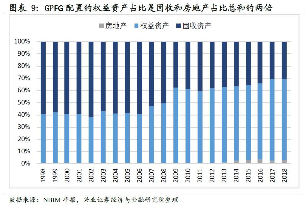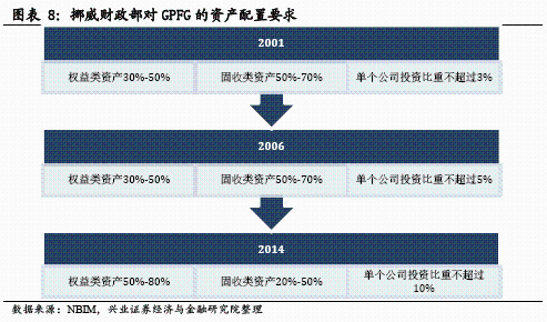 GPFG被NBIM接管后,投资范围从政府担保等低风险固收类产品扩大至权益资产,2010年开始在挪威财政部的批准下开始将海外房地产纳入资产配置,目前地产配置比例占3%。除此之外,挪威财政部对GPFG资产配置的变化体现了对权益投资的重视度提升:1)对资产配置的限制逐渐放松,财政部取消了对投资地域和固收类资产投资范围的限制,提高了在单个公司中可持有的股权比例上限;2)加大对高风险资产的投资比例,对权益类资产限制从30-50%提高到50-80%。