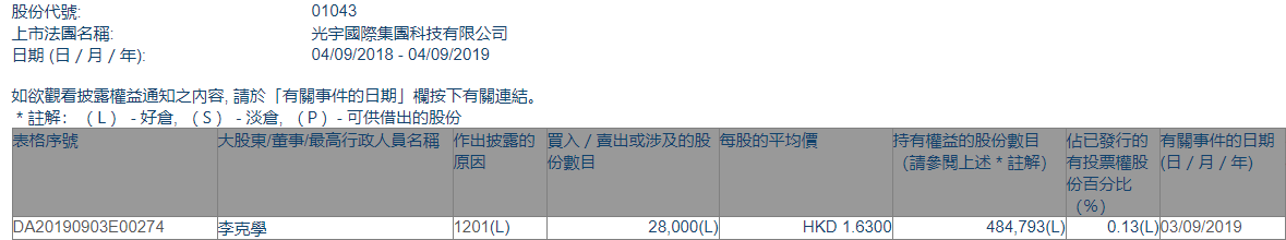 根据港交所最新权益披露资料显示,2019年9月3日, 光宇国际集团科技(01043.HK)遭李克学以每股均价1.6300港元,减持2.8万股,总价约4.56万港元。