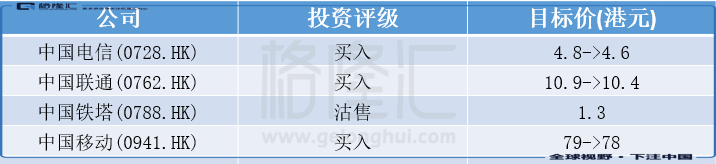 该行指出,中国铁塔的投资评级下降对中国联通的影响最大,该行对其目标价下调4.6%至10.4港元,对中国电信及中移动的目标价则分别下调4.2%及1.3%,至4.6港元及78港元。重申中移动、中国联通及中国电信“