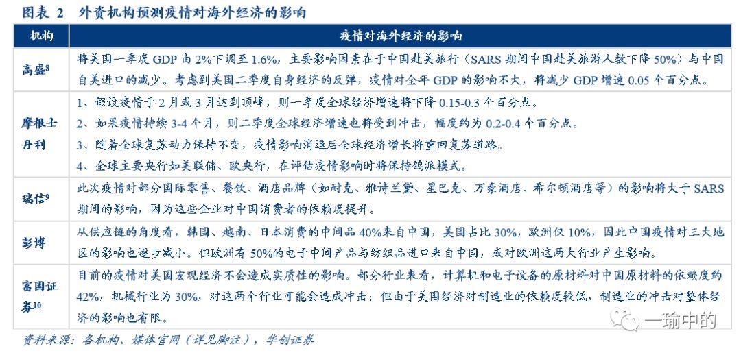 对海外影响的估算一般从旅游+进口与供应链两个角度进行测算。考虑到中国疫情影响出境游人数以及进口需求,高盛预计由此将影响美国Q1 GDP约0.4个百分点,摩根士丹利预计乐观情况下影响Q1全球增速0.15-0.3个百分点、悲观情况下Q2经济也将受到0.2-0.4个点的影响。而从供应链的角度来看,由于亚洲地区对中国出口的中间品依赖度高于欧美国家,因此亚洲国家受到的负面影响将更大;而部分国际零售、餐饮、酒店品牌(如耐克、雅诗兰黛、星巴克、万豪酒店、希尔顿酒店等)由于高度依赖中国市场,也将受到比较明显的冲击,这类公司的股价短期或受到一定冲击。