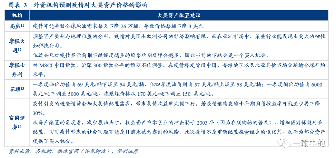 普遍看好权益市场后续表现,但对大宗商品价格调低预期。外资机构普遍认为受到疫情影响,A股与亚洲市场短期会受到冲击,但这恰好带来了买入机会,对权益资产全年表现的预期不作调整,仍较为乐观。但高盛、花旗、富国证券均认为原油受此次疫情会有下跌压力,富国证券同时认为避险情绪的大幅提升会带来美债收益率的进一步下调。