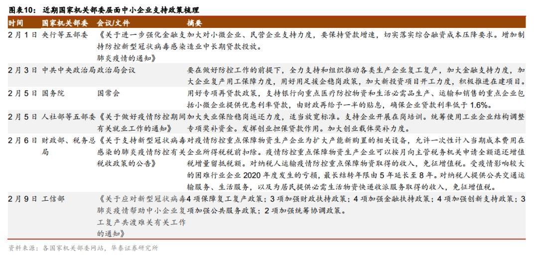 疫情期间,从现金流入看,大量中小企业的日常经营基本停滞,外部融资或是主要途径;从现金流出看,主要包含两大部分,一是人力成本支出,包括工资支付和社保缴纳;二是租赁成本支出,即门店或厂房的租金支付。针对中小企业在各方面的困境,国家机关部委和各级地方政府纷纷出台相关扶持政策,在降低融资成本、协商员工工资、缓缴社保、减免租金等方面均提供了相应支持,从一定程度上缓解了中小企业的困境,但企业面临的生产经营停摆、下游需求不足问题仍难以避免。