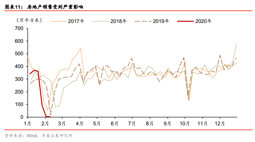 其次,房地产销售接近停滞。除了三四线返乡置业以外,房地产其他销售也受到疫情的冲击,部分房地产销售从线下转向线上,但由于房地产产品高总价、异质性等特点,线上模式并无法完全冲抵线下售楼处关停带来的影响,当前的房地产销售仍接近停滞状态。同时,由于复工时间受疫情影响延后,房企施工行为和全年工程进度也将受此影响。由于中国的商品房采取的是预售制度,因此工程进度的滞后首当其冲的,是近期拿地原计划抢在3、4月份天气回暖后开盘的项目,由于建设进度的放缓,这些项目领取《预售许可证》和开盘的时间也会相应顺延,后续新推盘也会受到影响。根据历史经验,虽然1月、2月是房地产销售淡季,在全年销售规模中占比不足10%,若疫情在2月上旬得到有效控制,后续的复工、推盘得以顺利进行,那对一季度、全年的房地产销售影响程度尚可;若疫情成为持久战、攻坚战,则居民的购房意愿、房企的复工、推盘均会受到明显影响,一季度房地产销售可能会面临大幅下滑。
