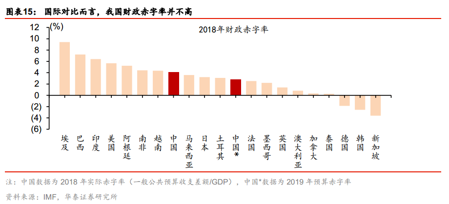 第一,扩大预算赤字以打开积极财政空间的必要性提高,3%的赤字率约束或可突破。国际对比,我国的财政赤字率并不高,且在经济下行周期扩大赤字、上行周期缩小赤字也是其他国家财政的常态,更能体现逆周期调节的内涵。