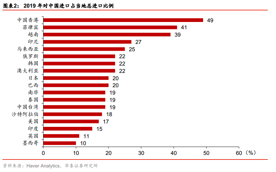 从全球视角看,新冠疫情的短期影响主要在于上游企业产能不足和人员、货物国际流动受阻。从产能角度看,此次疫情可能带来国际产业链上游零部件的“中国供给”不足。作为最大的世界工厂之一,中国的企业停产直接导致海外多条产业链面临零部件缺乏问题。以分布在亚洲为主的多个经济体对于中国进口的依赖度均较高,其中中国香港、菲律宾、越南来自中国的进口均超过30%。以汽车行业为例,受中国疫情影响,个别韩国车企已经选择停产或减产,现代汽车在韩国的大部分工厂于2月7日暂停生产,起亚汽车也从2月10日起停工,其核心困境是来自中国的汽车线束等零部件断供。
