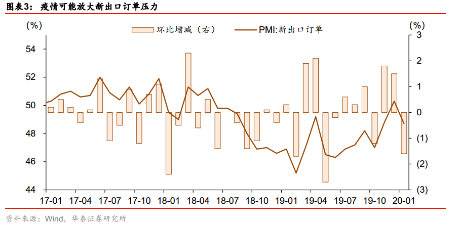 企业高层与海外销售服务人员商旅活动受到波及,从而影响新订单的商贸谈判,国内企业出口贸易业务增量动力不足。在贸易环境缓和的背景下,疫情的爆发或为出口贸易带来新的压力。1月新出口订单PMI环比下滑1.6%,且尚未完全反映疫情冲击,预计新出口订单将进一步下滑。