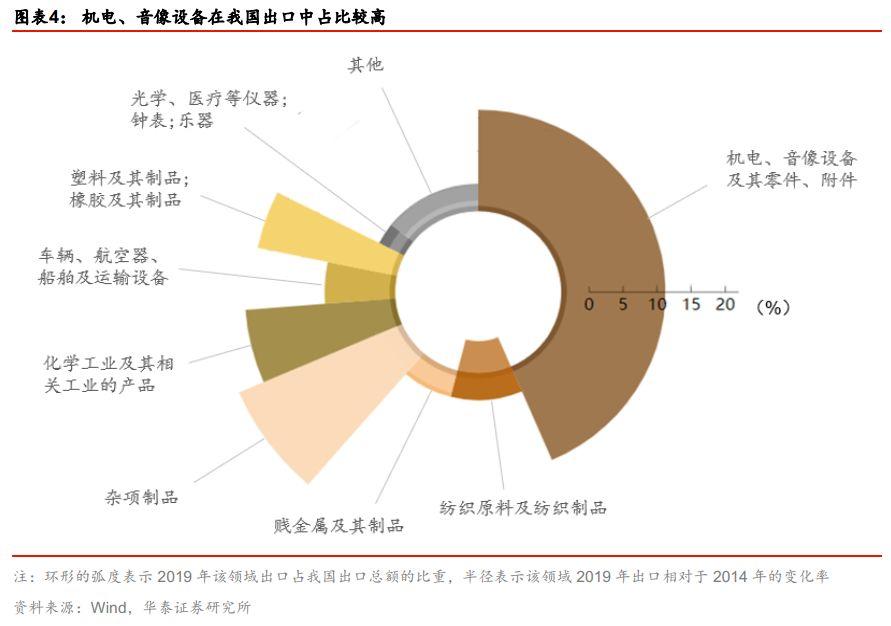 应对世界产业布局变化的唯一出路,是提升自身在全球价值链体系中的核心位置和竞争力。我国产业升级和出口结构转变趋势已经显现,但在国际产业链的地位尚需加强。按照HS分类标准,2019年我国出口结构中占比最高的为机电、音像设备及其零件、附件,占出口总额的44%,其次是纺织原料及纺织制品,占出口总额的10%。对比2014年看,代表高端制造的机电音像设备持续增长,而代表低端制造的纺织产品有所下滑,我国出口产品结构由劳动密集型产业开始逐步向技术密集型转变。