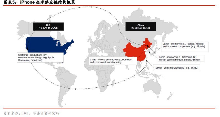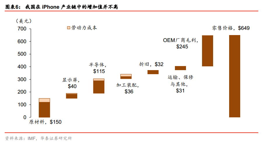我国在高端制造产业链分工中提供的部分较为脆弱,在面临外生冲击时可能受到较大影响。以苹果产业链为例,从部门分工看,我国在iPhone的生产中仍承担大量装配、加工等低端工作,具有一定的可替代性,面临东南亚等地区的挑战;而半导体、存储芯片等高新技术领域仍以美国、日本、韩国为主。从增加值角度看,在iPhone整机售价中,原材料、半导体成本占比最高,而来自中国的加工装配等部门占比相对较低。