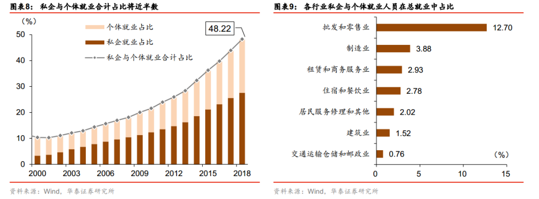 中小企业的就业吸纳能力较强,但抗风险能力较差。在就业市场中,私营企业、个体企业就业人员占比将近半数,且所从事的行业以批发和零售业为主,受疫情的冲击较大。中小企业自身资金实力较弱、行业地位较低,在面临重大风险时的抵抗能力更弱。相对于大型企业面临的需求萎缩问题,中小企业的困境将直接上升至存活问题。根据中欧商业评论发布的调研报告显示,从现金流来看,34%的企业只能维持1个月,33.1%的企业可以维持2个月,17.91%的企业可以维持3个月,只有9.96%的企业能维持6个月以上。疫情冲击若引发中小企业的大批倒闭、停业,我国就业岗位可能大幅缩减。