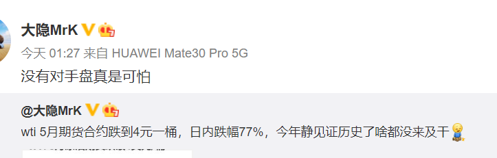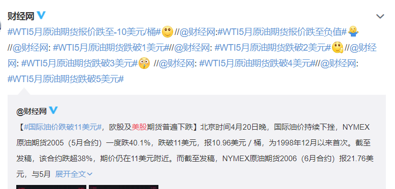 份瑞穗期货主管Bob Yawger表示:“WTI原油期货跌至负值,这是历史性的一天。这表明没有空间储存原油,基本要随水冲走,原油一文不值。现在的状况是是输油管道和库存都是满载,但是很奇怪的一点是,EIA数据并没有显示当前库存原油达到最大储能。暴跌的原因还有做多5月合约的交易者急于平仓。”