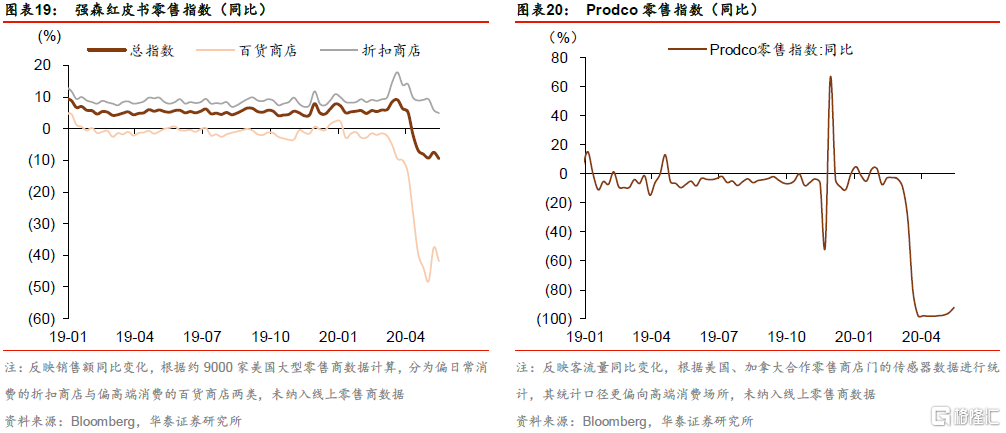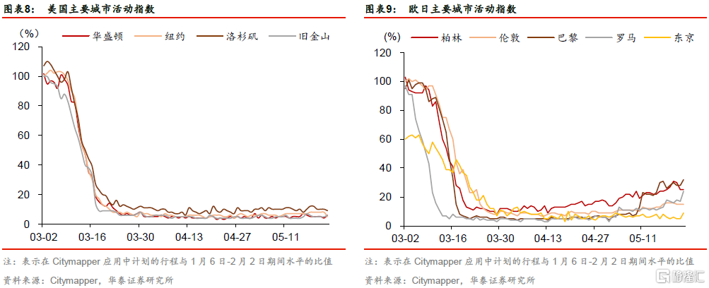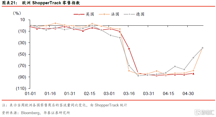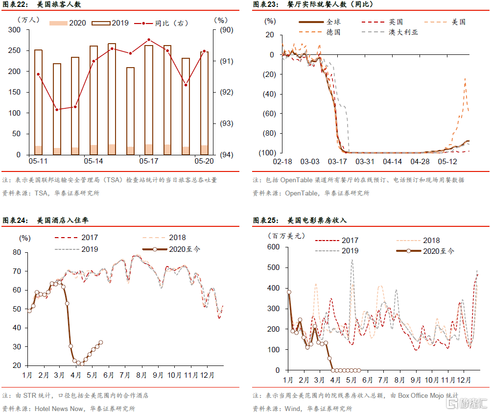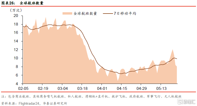 从零售销售方面看,滞后公布的5.4-5.11当周德国、法国ShopperTrack零售店客流量同比均大幅回升至-40%左右,近期乐观的经济重启形势或将带动零售业进一步复苏。从餐饮娱乐方面看,OpenTable统计的各国实际就餐人数同比变化近日出现不同幅度回升。从全球来看,5月23日这一指标录得-87.75%,餐饮活动处于持续恢复阶段,其中德国自5月21日一度回升至-24.40%,继续领跑海外餐饮业恢复进程,英国情况则仍不理想。从航空旅游方面看,全球航班数量仍在稳步回升,5.18-5.24当周平均数量达9.9万次,相较于前一周增加0.9万次。