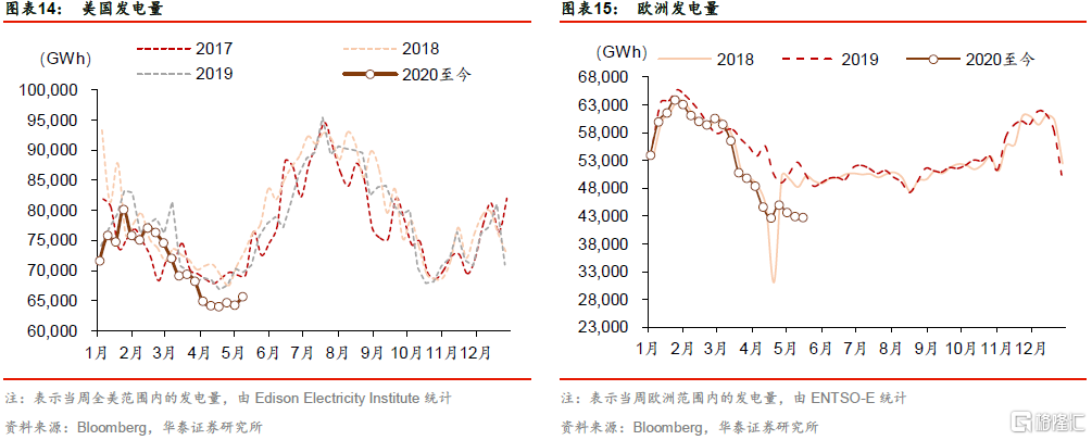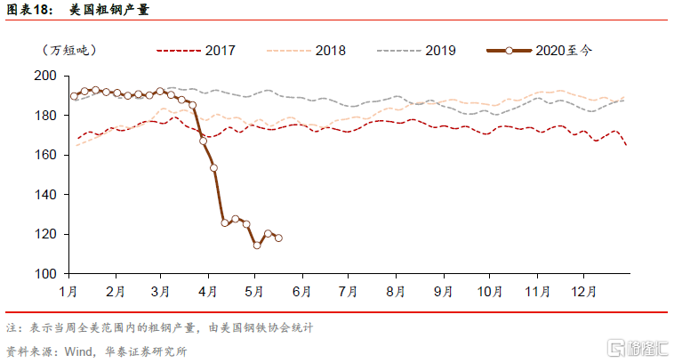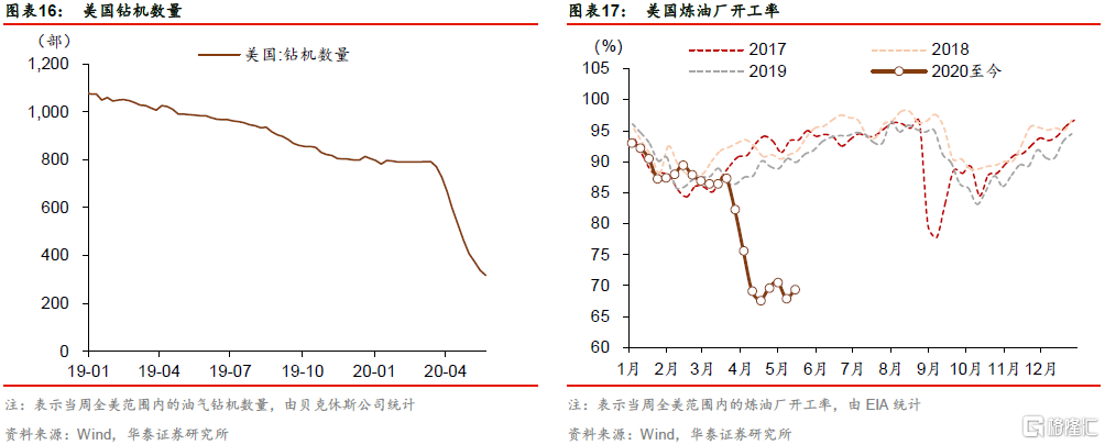从发电量上看,5.8-5.15当周Edison美国发电量环比回升0.61%,相较去年同期仍存在6.9%的差距。从美国能源企业的生产状况看,5.8-5.15当周EIA公布的炼油厂开工率为69.4%,相比前一周的67.9%回升1.5个百分点,目前仍在低位震荡,相较于往年同期90%左右的水平仍存在较大差距;5.8-5.15当周贝克休斯公司公布的美国油气钻机数量录得318部,相较于前一周进一步减少21部。目前美国所有50个州均已进入重启阶段,能源等工业品需求有望逐步回升,或将带动供给端产能恢复。