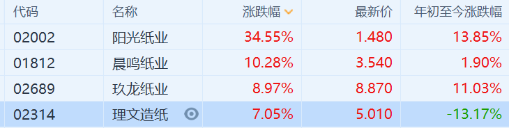 港股纸业股全线大涨:阳光纸业大涨35%,晨鸣纸业涨超10%
