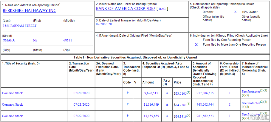 据SEC(美国证券交易委员会)最新文件显示,巴菲特旗下伯克希尔·哈撒韦在当地时间7月20日~22日之间,对美国银行[BAC.N]进行了3390万股,约8.13亿美金(约合人民币57亿)的增持。该笔增持后,巴菲特持股美国银行增至9.81亿股,持股比例由一季度末的略超10%提升至11.3%。至此,巴菲特对美国银行持股占比、持股数量均创新高。