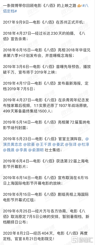 2017年9月9日電影《八佰》在蘇州正式開機;2018年4月27日,經過長達230天的拍攝,《八佰》宣告殺青。但就在去年6月上映前夕,影片卻被突然下檔。