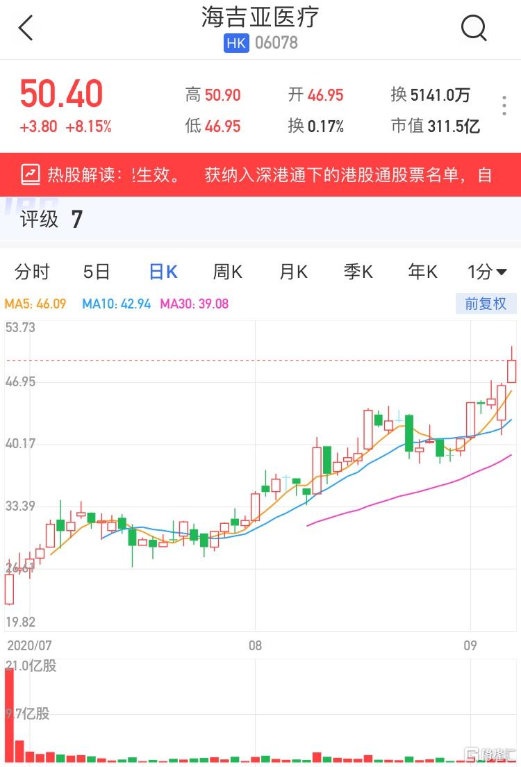格隆汇9月7日丨海吉亚医疗(6078.HK)高开高走,盘中高见50.9港元再创历史新高,现报50.4港元,涨8.15%,暂成交5141万港元,最新总市值311亿港元。该股自今年6月29日于港交所上市迄今,仅仅逾2个月时间较发行价18.5港元已累涨超1.7倍。深交所上周五(4日)宣布,海吉亚医疗获纳入深港通下的港股通股票名单,自9月7日(即今日)起生效。此外据悉,公司曾发布中期业绩称,期内营收同比增加22.8%至6.323亿元(人民币,下同);毛利同比增加39.4%至2.163亿元;经调整净利润同比增加65.4%至1.34亿元;每股基本盈利0.01元。