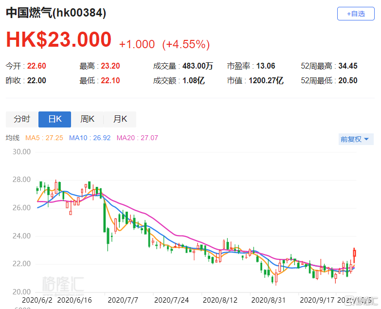 港股异动 | 中国燃气(0384.HK)涨4.55% 9月耗资逾1.3亿回购股份