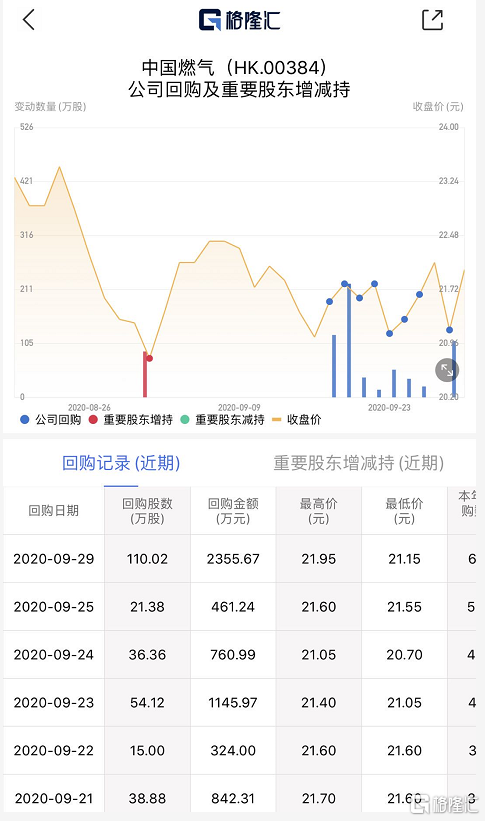 格隆汇10月5日丨中国燃气(0384.HK)涨4.55%,报23港元,总市值1200亿港元。进入9月份以来,中国燃气共进行了八次回购操作,累计回购金额达1.326亿港元,此外,9月21日,公司与中国移动通信集团有限公司订立战略合作框架协议。双方将在5G有效赋能重点民生行业、燃气行业与通信业务结合,共同发展智慧厨房,以及开放双方业务通道的基础上,积极开展数字经济合作,共同实现高质量发展。