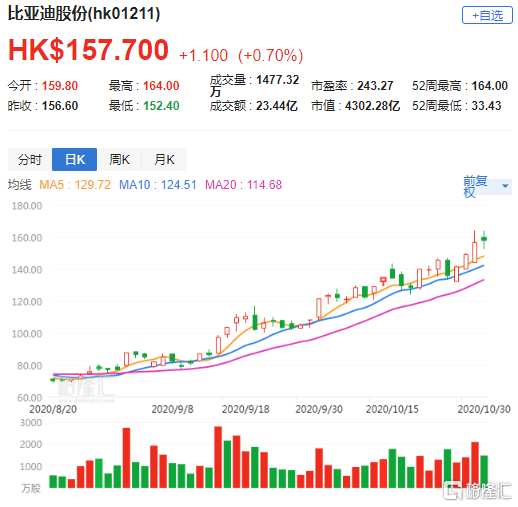 野村发表研究报告指出,比亚迪(1211.HK)截至9月底止第三季度纯利按年急升13.6倍至17.5亿人民币,由于公司全新旗舰车型“汉”和改款旗舰车型“唐”累计接获大量订单,预料继续推动新能源汽车销量,第四季度汽车行业持续向好。野村维持比亚迪H股买入评级,目标价为166港元。