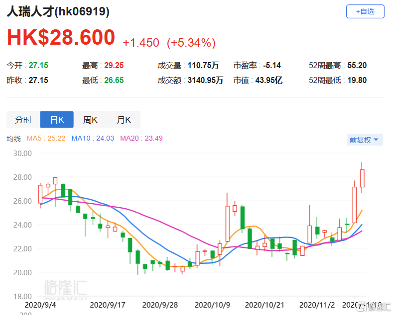 格隆汇11月10日丨继昨天大涨逾13%后,人瑞人才(6919.HK)再涨5.34%,报28.6港元,股价创近2个月新高,总市值44亿港元。11月4日晚,人瑞人才发布公告称,公司董事会获公司执行董事、主席、行政总裁兼控股股东张建国通知,由张建国全资拥有的公司名丰控股有限公司自2020年11月2日起至2020年11月3日止在市场上以加权平均价约为每股23.51港元收购合共4.05万股公司股份(相当于公司已发行股本总数约0.03%),总代价为约95万港元。收购事项完成后,名丰持有4640.85万股股份,持股比例由约30.17%增加至约30.20%。这是继人瑞人才公布2021年经调整净利润目标后,人瑞人才总裁首次增持公司股份。