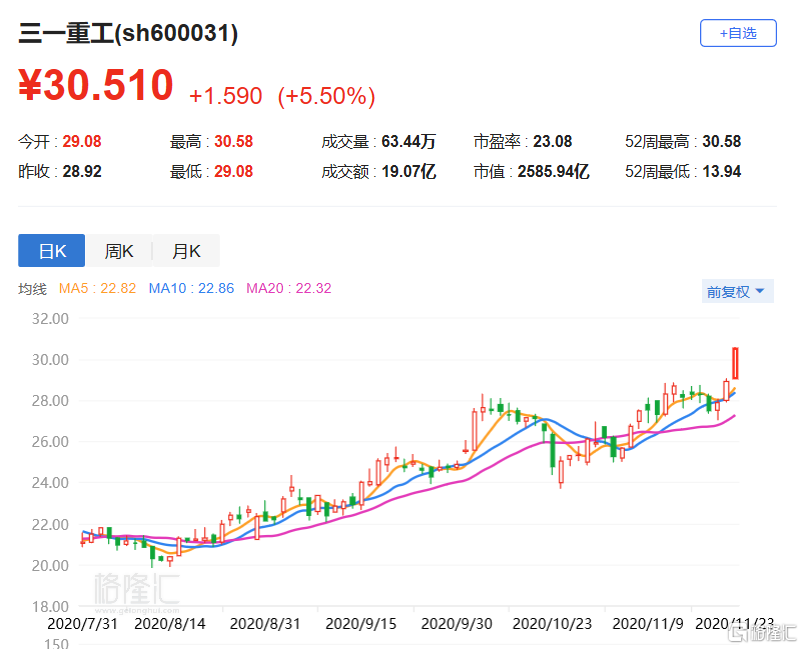 格隆汇11月23日丨三一重工(600031.SH)涨5.5%,报30.51元,股价再创历史新高,今年累计涨幅达80%,最新总市值2586亿元。上周五,三一重工现身沪股通十大成交活跃股,位居沪股通港资成交额第5位,港资总计成交6.14亿。其中,买入4.69亿,卖出1.44亿,净买入3.25亿,净买入额占该股当日总成交量的14.06%。
