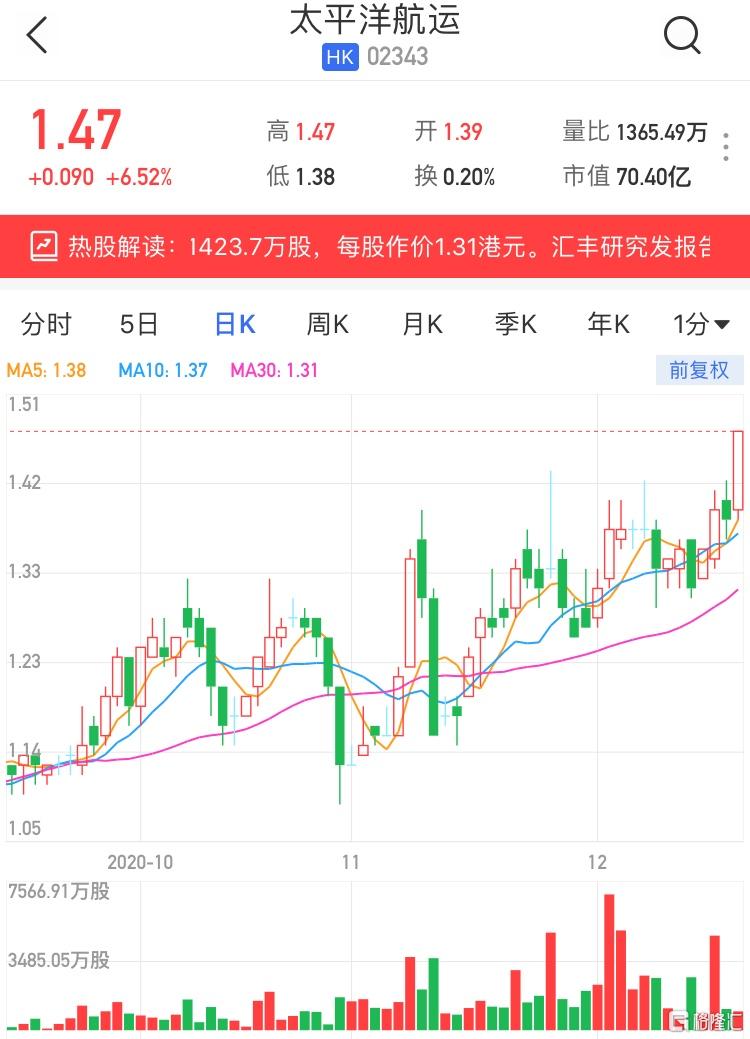 格隆汇12月17日丨太平洋航运(2343.HK)现报1.47港元,涨6.52%,股价创今年1月29日以来近11个月新高,暂成交1365万港元,最新总市值70亿港元。港交所权益资料显示,太平洋航运获M&G Plc于12月11日在场內以每股均价1.313港元增持1423.70万股,涉资约1869.32万港元。增持后,其持股比例由6.97%增持至7.26%。汇丰研究最新发研报指,太平洋航运目前处于更有利的供求平衡环境,波罗的海干散货指数有迹象见底,该行升其目标价至1.7港元,评级“买入”。
