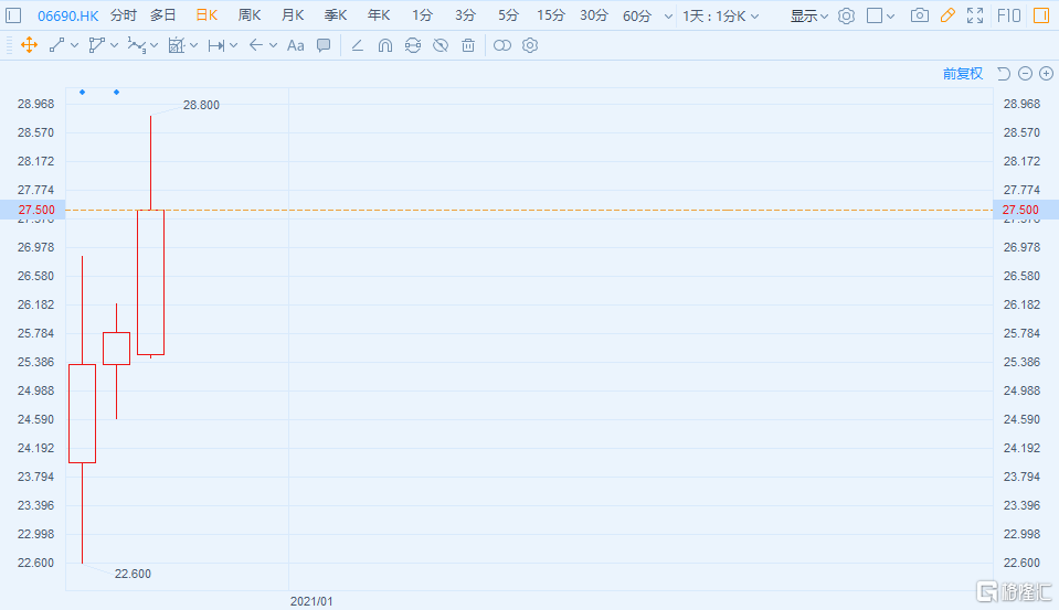格隆汇12月28日丨上周三(23日)以介绍方式在联交所主板上市的海尔智家(6690.HK)已连续三个交易日上涨,现报27.5港元,涨6.59%,暂成交16亿港元,最新总市值2482亿港元。中金近日发研报指,首次覆盖海尔智家并予目标价36.82港元,评级“跑赢行业”。报告称,海尔具有前瞻性的战略目标、管理创新能力,认为海尔在高端品牌卡萨帝、全球品牌布局方面正在进入收获期。此外,麦格理亦首次覆盖予其“跑赢大市”评级,目标价41.7港元,在收入增长及毛利扩张下,该行指公司今年至2022年的盈利年均复合增长率料达20%,料引发估值重评。