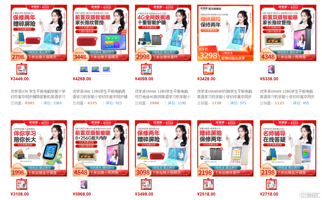 我们从优学天下旗下产品优学派的线上销售情况来看。京东前五销售商品的均价为4058元,最高价为4998元,淘宝旗舰店的活动价均价亦高达3378元,最高活动价为4348。要知道128 GB的IPAD8 WIFI款价格才2999元。为什么学习机的价格这么高?优学派的高端U系列的平均出厂价约1521元,其他系列的平均出厂价仅1000元,也就是终端价格较出厂价翻了三倍。家长在学习机上砸下的钱,大部分是花在了销售渠道上。