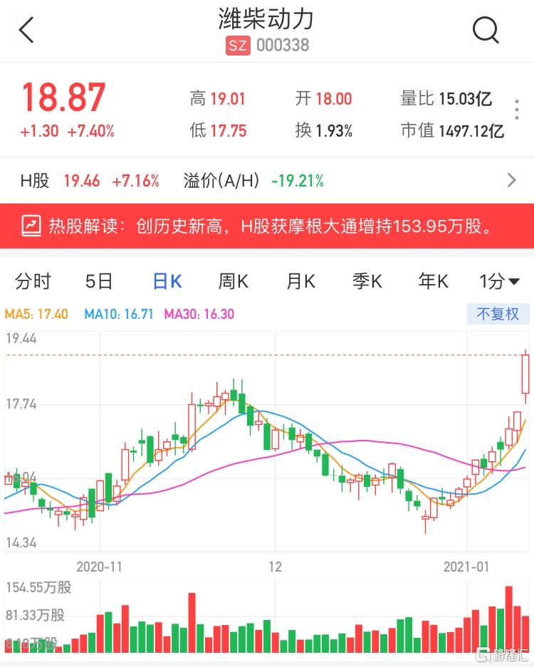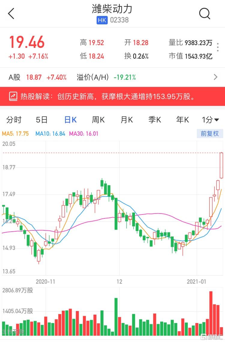 格隆汇1月13日丨潍柴动力(2338.HK)高开高走,盘中高见19.52港元创历史新高,现涨7.16%报19.46港元,最新H股市值1543亿港元。潍柴动力(000338.SZ)亦涨超7%创历史新高,现报18.87元,最新A股市值1497亿元。联交所最新资料显示,摩通于1月5日增持公司H股153.95万股,增持后其持股比例由4.99%增持至5.07%。大和曾发研报指,潍柴动力计划为其新的H系产品建设生产基地,并符合最新的国六标准,相信有助公司发展热效率发动机,及达至2025年目标销售200万引擎,重申“买入”评级,目标价21.4港元。天风证券指2021年重卡行业销量有望再次超出市场预期,推荐重卡发动机龙头潍柴动力等。