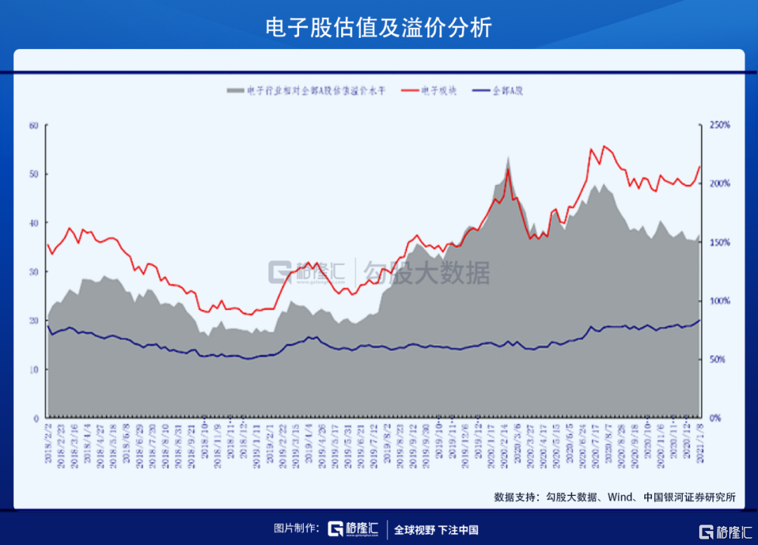 行业估值溢价角度,截至2021年01月08日,全部A股滚动市盈率为20.03倍。截至2021年12月31日电子行业相对全部A股溢价为156.92%,估值溢价水平升至高位后回落,一个月内下降了2.92个百分点。