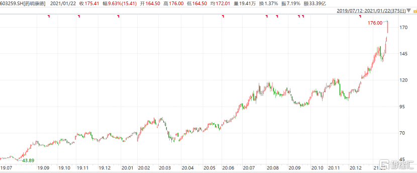 今日,药明康德股价一路高歌,盘中触及涨停,早盘报收于175.41元/股,总市值突破4000亿元关口。港股药明康德大涨10%,在其带动下,药明生物、药明巨诺-B等药明系其他个股亦表现亮眼。