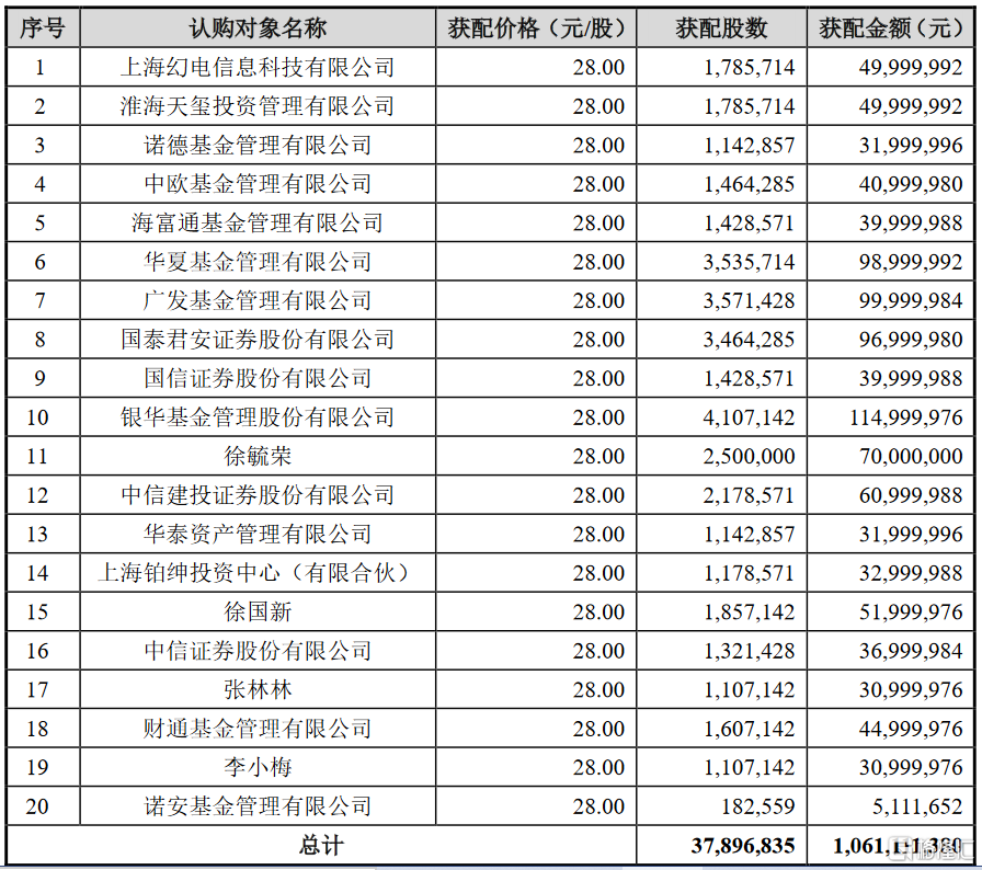 格隆汇 2 月 10日丨掌阅科技(603533.SH)披露非公开发行A股股票发行情况报告书,确定此次非公开发行股票的发行价格为28.00元/股,发行数量为3789.6835万股,募集资金总额约10.61亿元,未超过发行人股东大会决议和中国证监会批文规定的上限。发行对象及其获配股数、获配金额的具体情况如下: