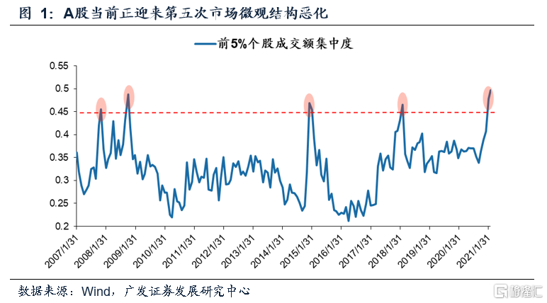 A股正迎来第五次市场微观结构恶化。我们于2.24发布《扩散升级》,提出“A股微观结构恶化”,引起了市场的普遍关注。“微观结构恶化”衡量的是市场对局部领域预期过于一致并且市场上最乐观的筹码均已入场/市场上最悲观的投资者已经离场的过程。当前A股成交额排名前5%的个股的成交额占全部A股占比创下历史极值,历史上类似的情形出现过4次,市场均发生了巨大的反转。
