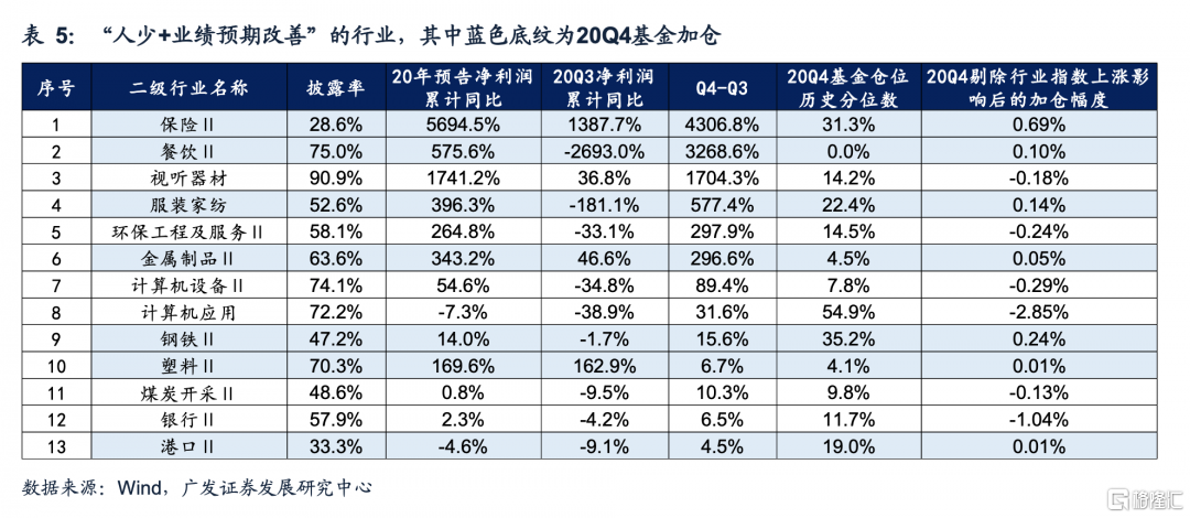“热门股”的远期前景已经被最乐观的投资者所预期,暂避锋芒,扩散升级。建议利用调整继续配置“第三波顺周期行情”,布局“人少+逻辑改善”的方向。当前与15年1月类似,前期的“热门股”行情已经被市场最乐观的交易者参与,利好本身较难促进微观结构改善,市场下一阶段或将迎来风格切换,行情继续扩散。恰逢财报披露季,从以下指标交集寻找行业:1. 20年业绩预告/快报改善;2. 基金配置分位数在历史50%分位数以下;3. 其中剔除股价因素Q4基金已有真实加仓迹象的行业更为占优。截止2月26日,我们梳理最新的业绩预告/快报发布数据,找寻年报预告累计增速较三季报改善最明显、20Q4基金配置处于08年以来历史分位数50%以下的行业如下表,代表行业如保险、餐饮、纺服、环保、计算机等,其中部分行业已经在20Q4获得公募基金的真实加仓(剔除股价上涨因素)。建议利用调整继续配置“第三波顺周期行情”,重点关注“人少+逻辑改善”的方向:1. “涨价”主线的顺周期及科技(有色金属/化工/半导体/面板);2. 景气拐点确认的低估低配大金融(银行、保险);3. 主题关注碳中和(参见2.25《全行业联合:谋局“碳中和”》)。