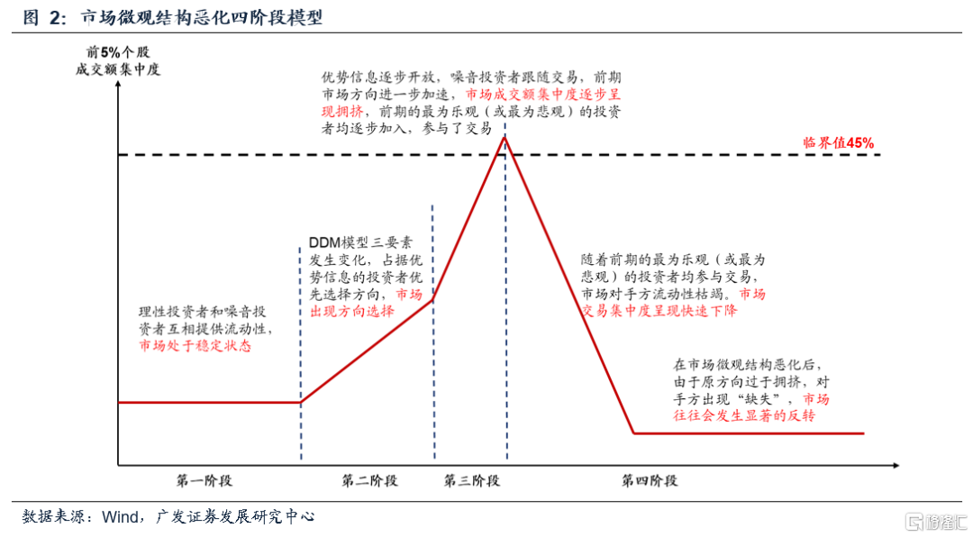●“市场微观结构恶化四阶段模型”充分阐述市场微观结构恶化时的市场微观结构演绎逻辑。阶段一:理性投资者和噪音投资者互相提供流动性,市场处于稳定状态阶段二:DDM模型三要素发生变化,占据优势信息的投资者优先选择方向,市场出现方向选择(结构性上涨或下跌)。阶段三:优势信息逐步开放,噪音投资者跟随交易,前期市场风格演绎进一步加强,市场成交额集中度逐步拥挤,“热门股”开始形成。阶段四:随着前期的最为乐观(或最为悲观)的投资者均参与了交易,市场交易集中度快速下降,“热门股”现象瓦解。在市场微观结构恶化后,由于原方向过于拥挤,对手方出现“缺失”,市场往往会发生显著的反转;此时市场的方向选择取决于DDM模型是否发生显著变化。