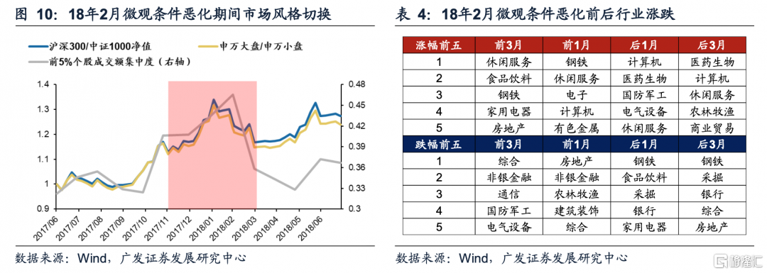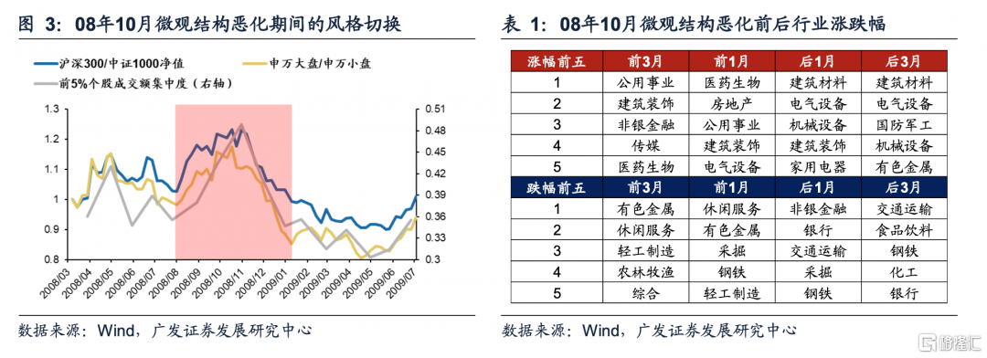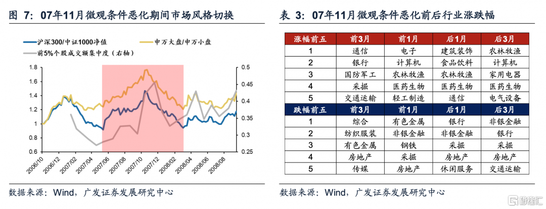 07年末至08年初,DDM核心条件反转+市场微观结构恶化,股市由牛转熊,市场风格切换。在2007年末全球金融危机爆发后,A股DDM模型分子分母端发生反转,导致市场最终发生牛熊切换——分子端,A股非金融盈利增速在08年一季度后转负,二季度后GDP增速、PMI、出口增速断崖式下跌,企业盈利及盈利预期转为悲观;分母端,08年危机前后央行密集加息加准,货币政策趋紧导致市场流动性收缩,同时海外金融危机蔓延激发悲观情绪导致市场风险偏好下行。在DDM三要素均发生逆转叠加市场微观结构恶化背景下,2007年11月后,市场由牛转熊,大小盘相对风格逆转,具有明显大盘风格的银行、非银等行业跌幅居前。