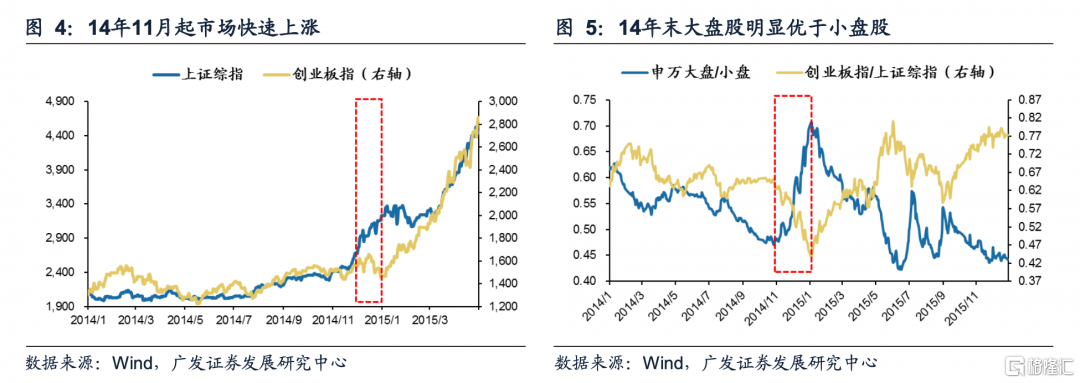 2014年末,随着央行的降息,宽松预期带动股市开启新牛市,以金融为主的大盘股领涨。2014年末,为了调节整体宏观经济的增长,中央对于房地产行业的态度发生了一定的转变。央行运用MLF\SLO\SLF等多种政策工具调节流动性,并于11月21日重启降息操作,为市场注入一剂强心剂。降息之后,市场情绪升温,股市的赚钱效应吸引了大量的新增投资者入场,带来增量资金。14年11月至14年年底,短短1个多月市场快速上涨,上证综指上涨超30%,显著跑赢创业板。非银金融、建筑、银行、钢铁、房地产等大盘股为主的行业领涨。