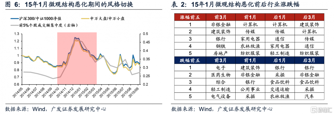 DDM三要素并未发生显著变化,市场微观结构恶化的结果是上涨结构扩散至了小盘科技股,发生了显著的风格切换。彼时DDM三要素并没有发生显著的恶化,市场仍在充裕流动性打造的牛市当中。随着市场微观结构的恶化,市场最乐观的投资者都已经拥挤在了金融股当中。在金融股对手方流动性枯竭后,市场中的交易者开始寻找不那么拥挤、但逻辑也仍在改善的小盘股。2015年1月后,大小盘股相对走势明显转向,市场风格发生显著切换。在市场微观结构恶化结束后,计算机、传媒、通信等小盘科技行业领涨,而前期“拥挤”交易的金融股则领跌。