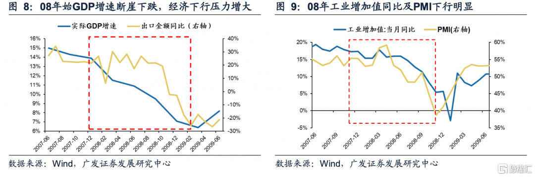 2008年金融危机带来A股风险偏好和基本面的恶化,市场形成悲观预期2008年年初开始,金融危机持续发酵,全球悲观情绪不断蔓延,A股也进入熊市。进入二季度,中国基本面也出现持续恶化,GDP增速下跌、PMI落至荣枯线以下,出口金额增长率也开始跌至20%敏感线以下,市场情绪更加悲观,A股的熊市呈现进一步加速下跌。有色金属、休闲服务、轻工制造等行业领跌,建筑装饰、公用事业、医药生物等大盘股领涨。