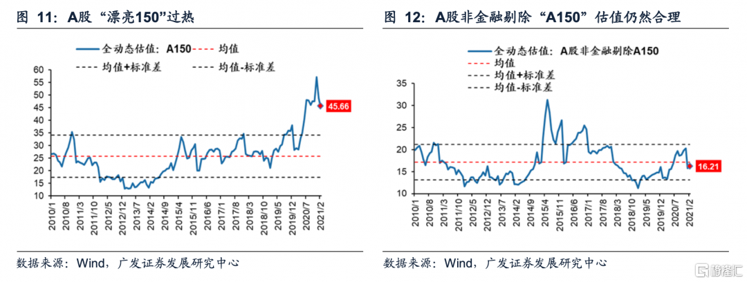 2. 市场微观结构恶化下,市场局部高估但整体并未高估:截至20年底“A150”的全动态PE估值已显著突破10年以来均值+1倍标准差的上限并不断上移,随着市场微观结构恶化“A150”估值遭受剧烈挤压;而A股非金融剔除A150的估值水平并不算高,仍处于10年以来均值下方;