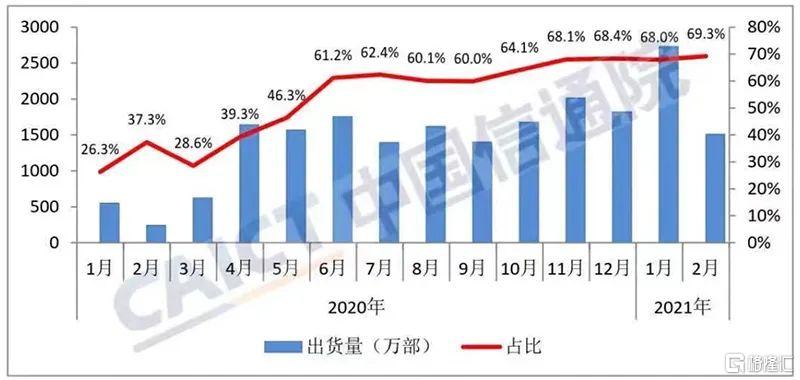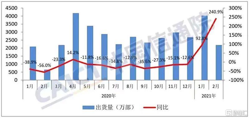 中国信通院数据显示,2021年2月,国内手机市场总体出货量2175.9万部,同比增长240.9%;1-2月,国内手机市场总体出货量累计6187.9万部,同比增长127.5%。