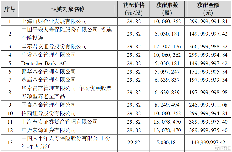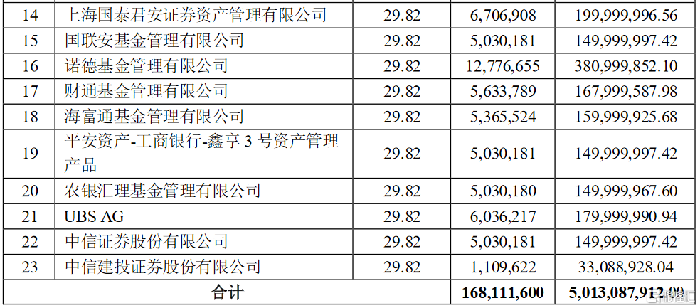 格隆汇 3 月 11日丨中国重汽(000951.SZ)发布非公开发行情况报告书暨上市公告书,结合首轮认购时的获配情况和追加认购的结果,此次发行最终获配发行对象共计23名,发行价格为29.82元/股,此次发行股票数量为168,111,600股,募集资金总额约50.13亿元。此次发行最终确定的发行对象及获配股数、获配数量、获配金额情况如下:
