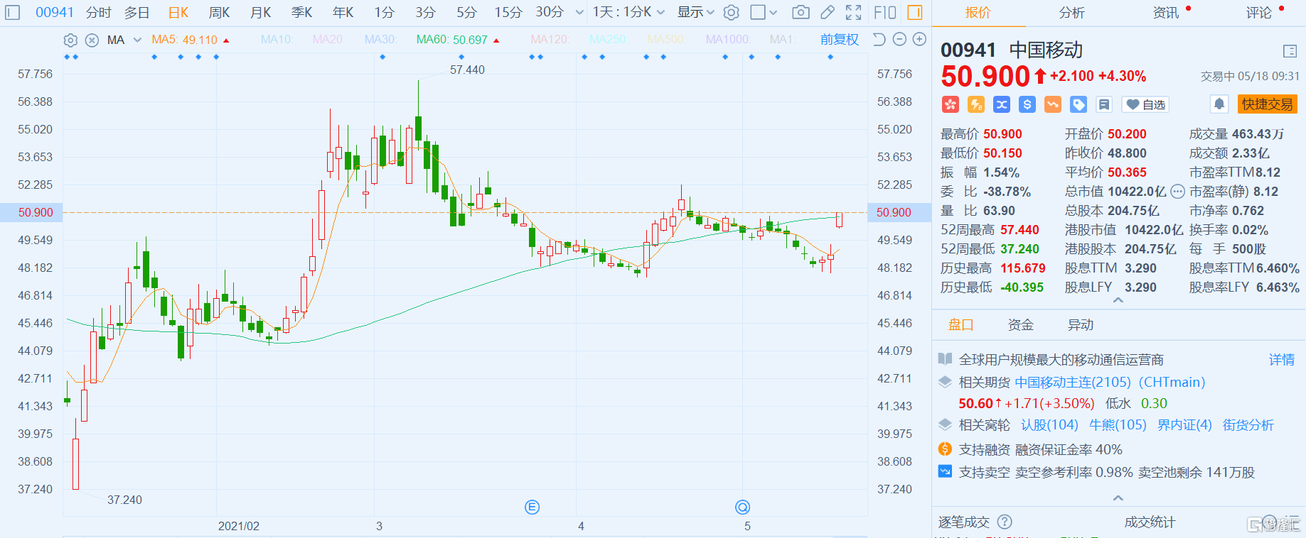 港股异动 | 中国移动(00941.HK)涨4.3% 宣布回A股上市