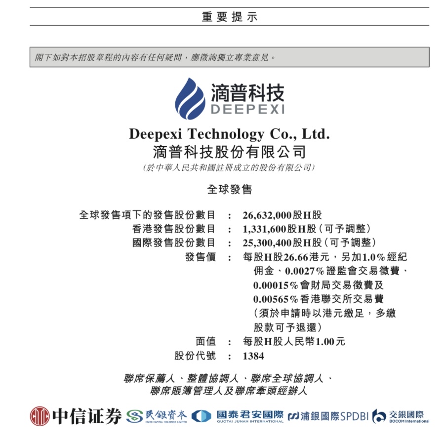 滴普科技股份有限公司(Deepexi Technology Co., Ltd., 01384.HK)正式啟動香港IPO,招股期為10月20日至10月23日,擬全球發售26,632,000股H股,並設有超額配股權;每股發售價26.66港元,每手200股,入場費約5,385.77港元;預期10月28日於聯交所主板掛牌,聯席保薦人為中信證券、民銀資本、國泰君安國際、浦銀國際及交銀國際。