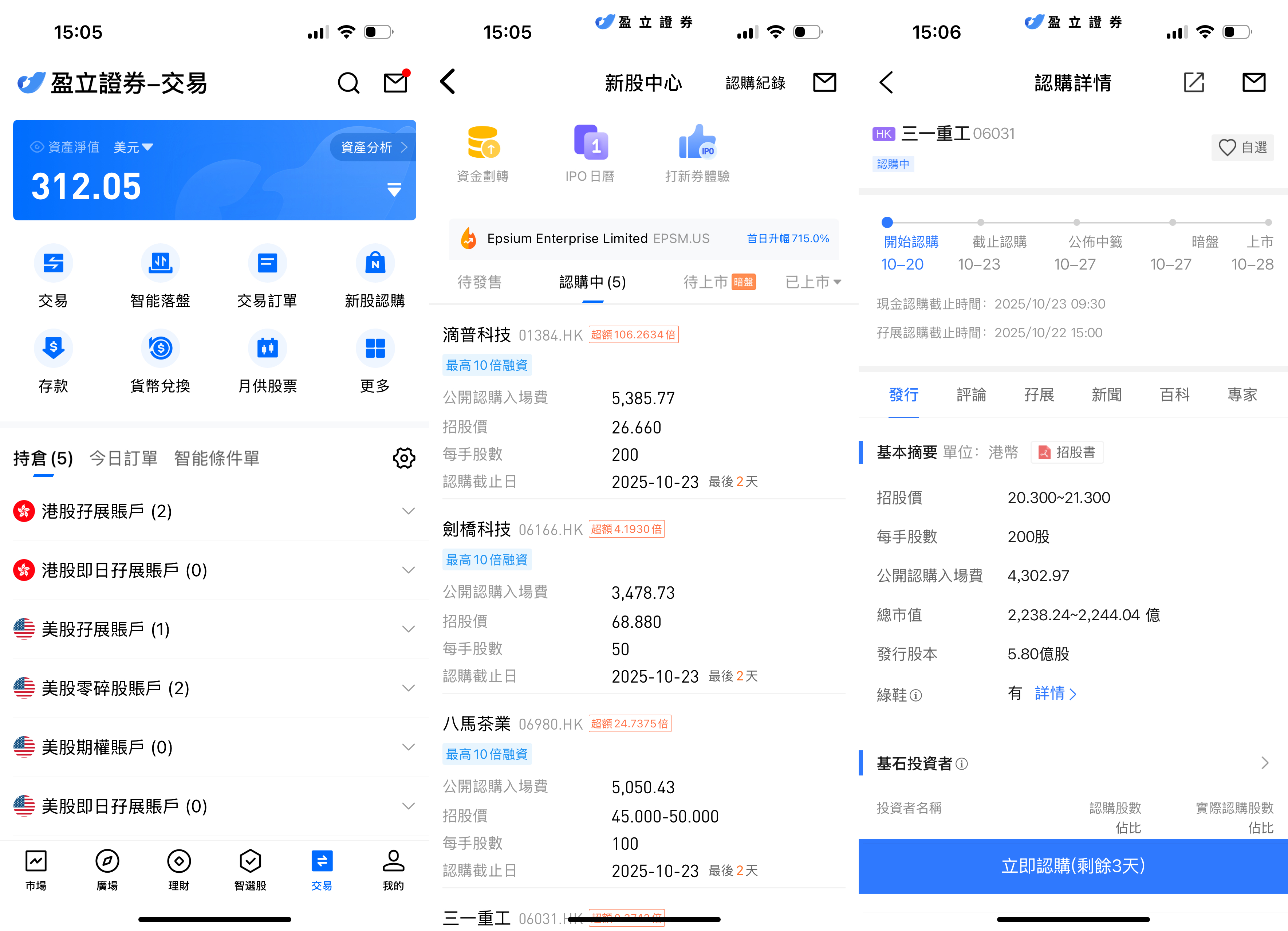 uSMART HK App 設有 IPO 中心,提供獨家優惠,客戶可在 App 即時認購公開發售之新股。登入 uSMART HK App 後,點選右下角「交易」,進入「新股認購」,選擇三一重工後點擊「公開認購」,填寫認購數量並提交訂單即可。