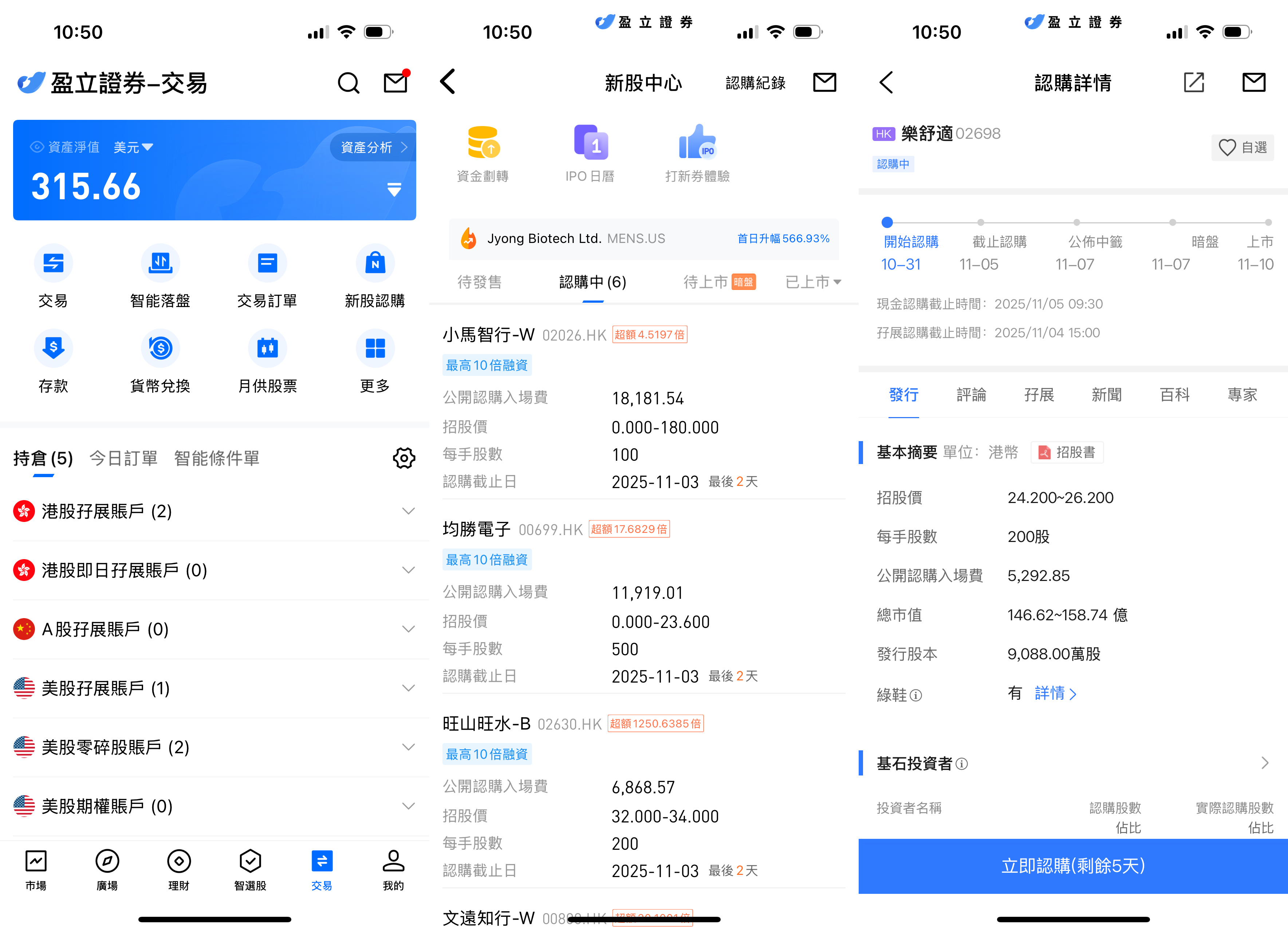 uSMART HK App 設有 IPO 中心,提供獨家優惠,客戶可在 App 即時認購公開發售之新股。登入 uSMART HK App 後,點選右下角「交易」,進入「新股認購」,選擇樂舒適後點擊「公開認購」,填寫認購數量並提交訂單即可。