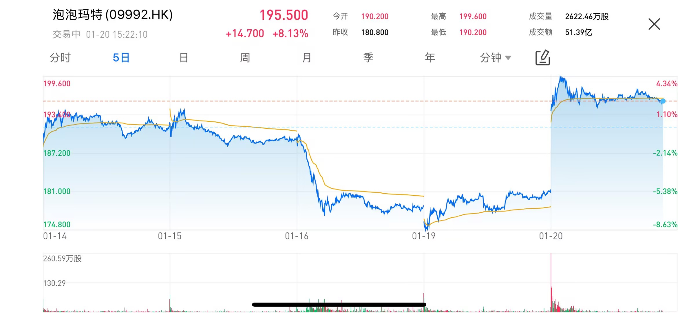 2026 年 1 月 20 日,泡泡瑪特(09992.HK)股價顯著走高,早盤高開後持續上行,一度漲近 9%,盤中報 190 港元附近,成交明顯放大,市場關注度快速回升。