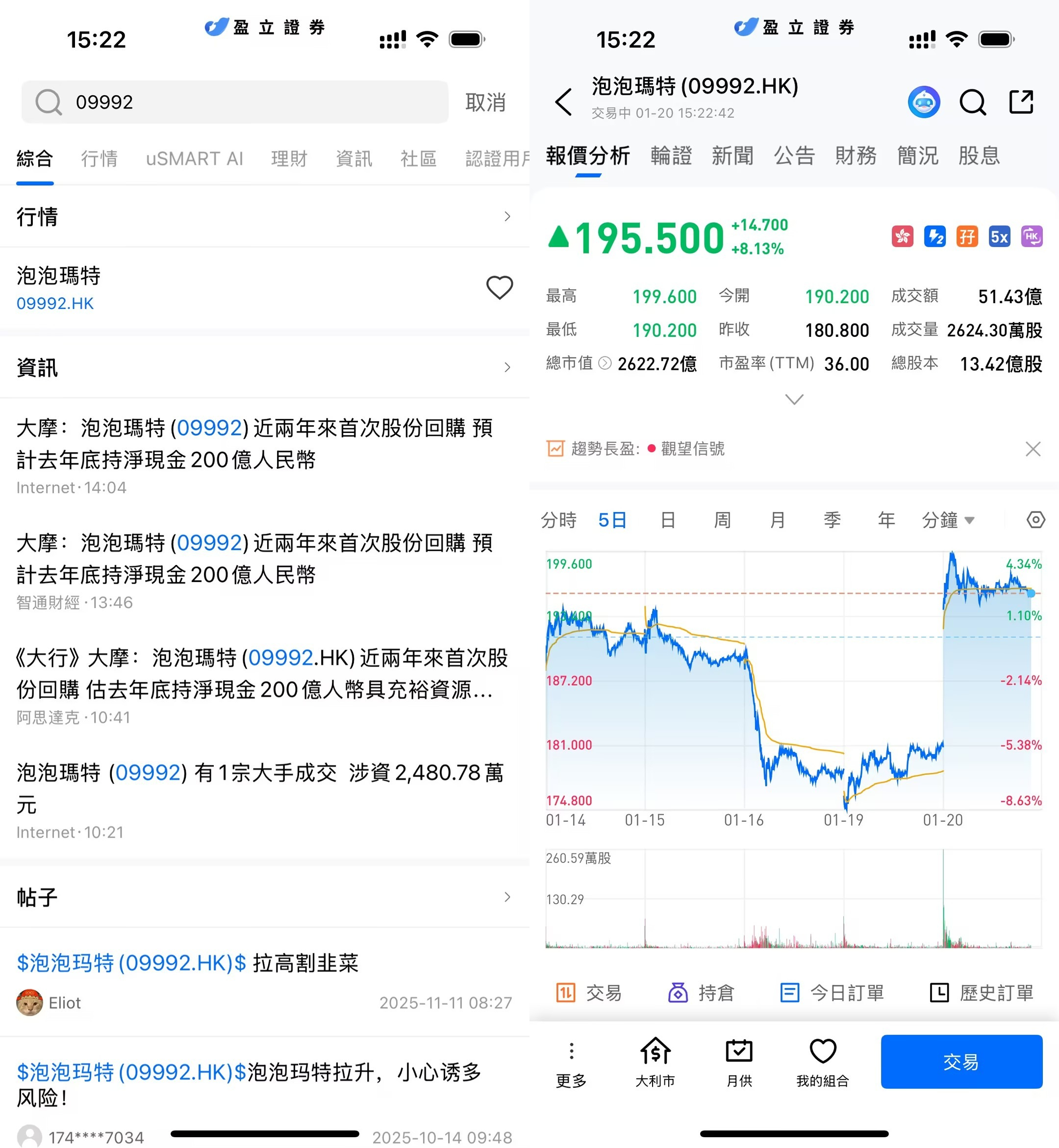 登入 uSMART HK APP 後,於頁面最右上方點擊「搜索」,輸入標的代碼(09992.HK)並進入詳情頁,瞭解交易詳情與歷史走勢。點擊右下角「交易」,選擇交易類型,最後填寫交易條件後送出訂單即可。
